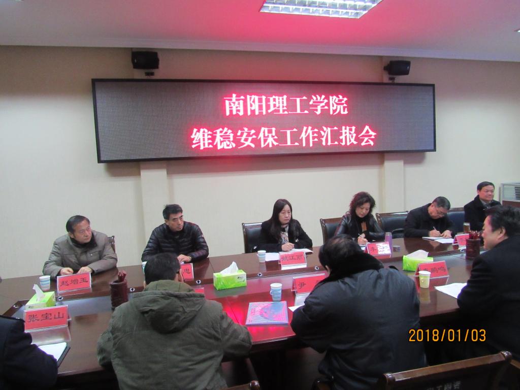 2018年1月3日下午,河南省公安厅姚江丽副支队长在市公安局有关领导陪同下一行7人莅临我校检查指导维稳安保工作。会议由校党委副书记秦鹏鸣主持,驻校警务室警官李冬梅、校内维稳安保成员单位领导及相关成员参加了会议。