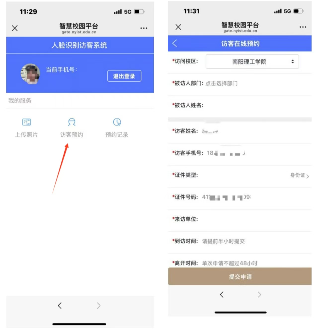 3、填写预约信息(包含被访人姓名、部门、访问时间和随行人员、车辆信息等)-提交申请: