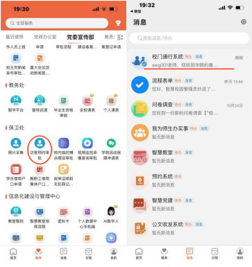 在服务中找到“保卫处--访客预约审批”或者在消息中找到预约消息;