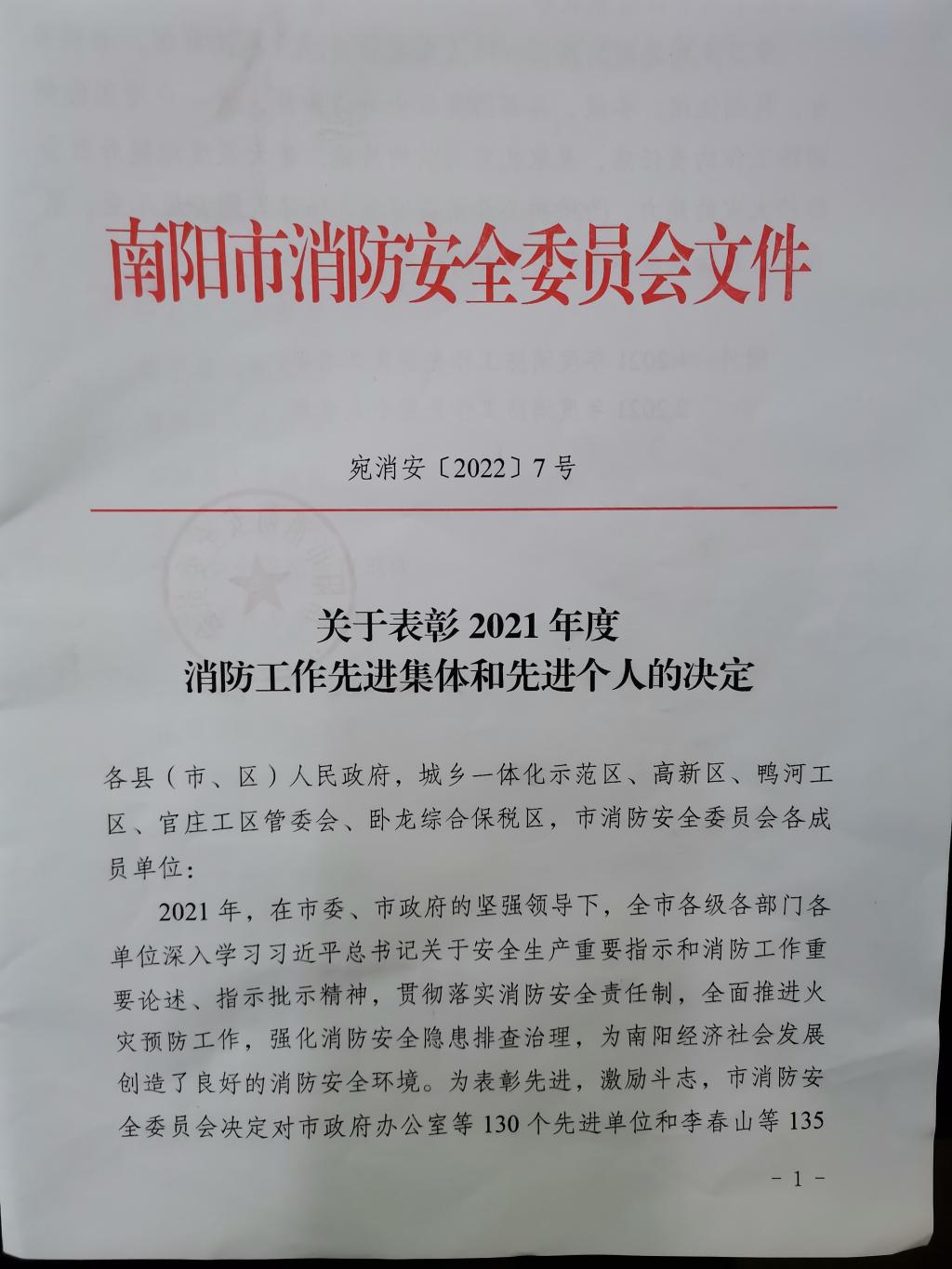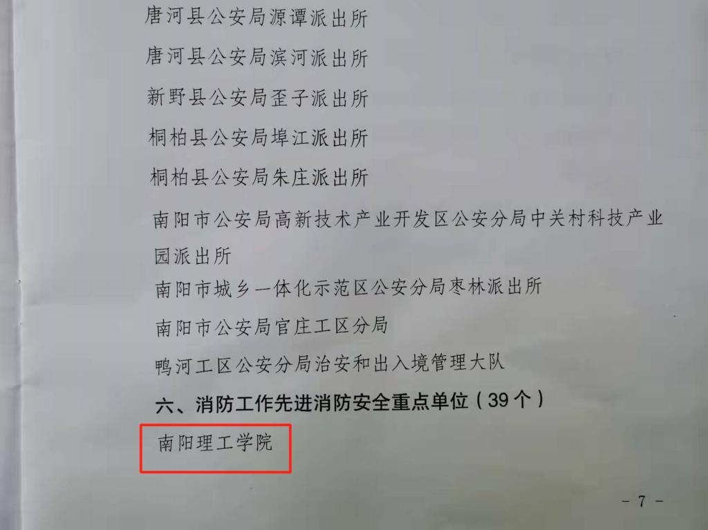 3月24日下午,在2022年度全市消防工作会议上,我校被评为2021年度消防工作先进消防安全重点单位。南阳市人民政府副市长石秀田出席会议并讲话,南阳市消防救援支队长邓战磊主持会议。