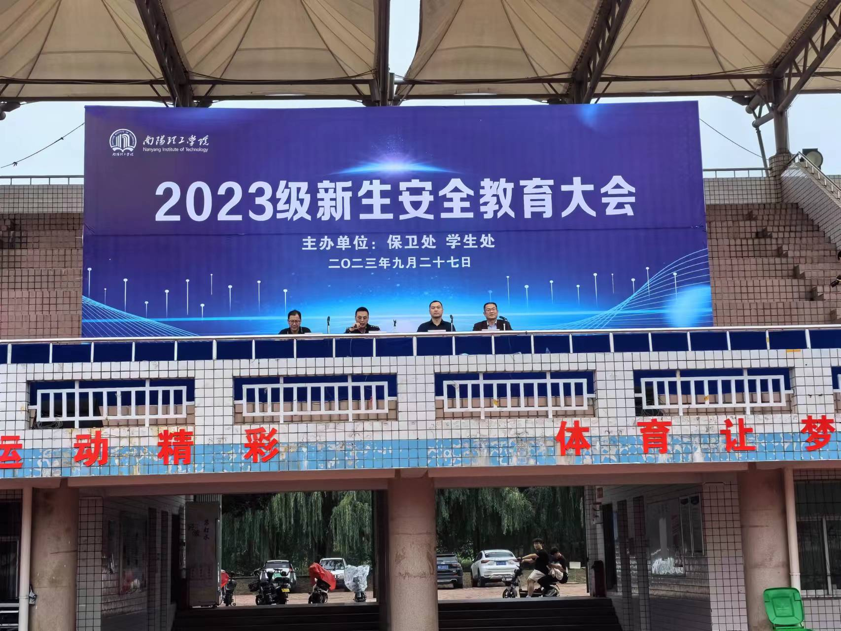(特约记者/张元朝)9月27日下午,我校在东南校区体育场举办2023级新生安全教育大会,2023级近6000名新生及新生辅导员和63名军训教官参加活动。