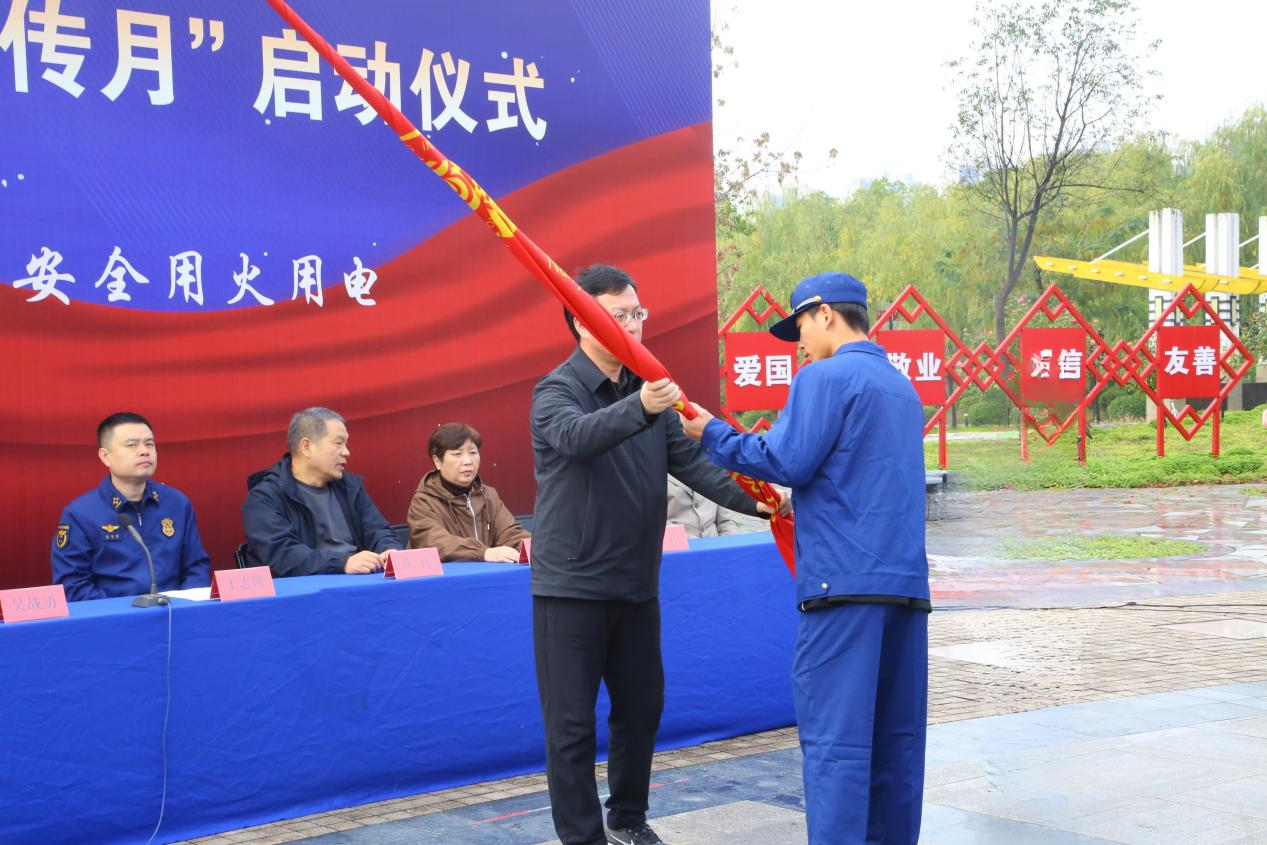启动仪式上,吴战勇副校长郑重地将写着“校园消防志愿者协会”的旗帜交到协会负责人手中,这面旗帜象征着责任与使命,也代表着全校师生的安全与期盼。吴校长鼓励志愿者们要把专业知识传递给每一位同学,让安全防范意识在校园生根发芽。